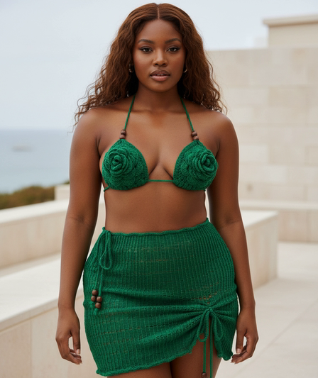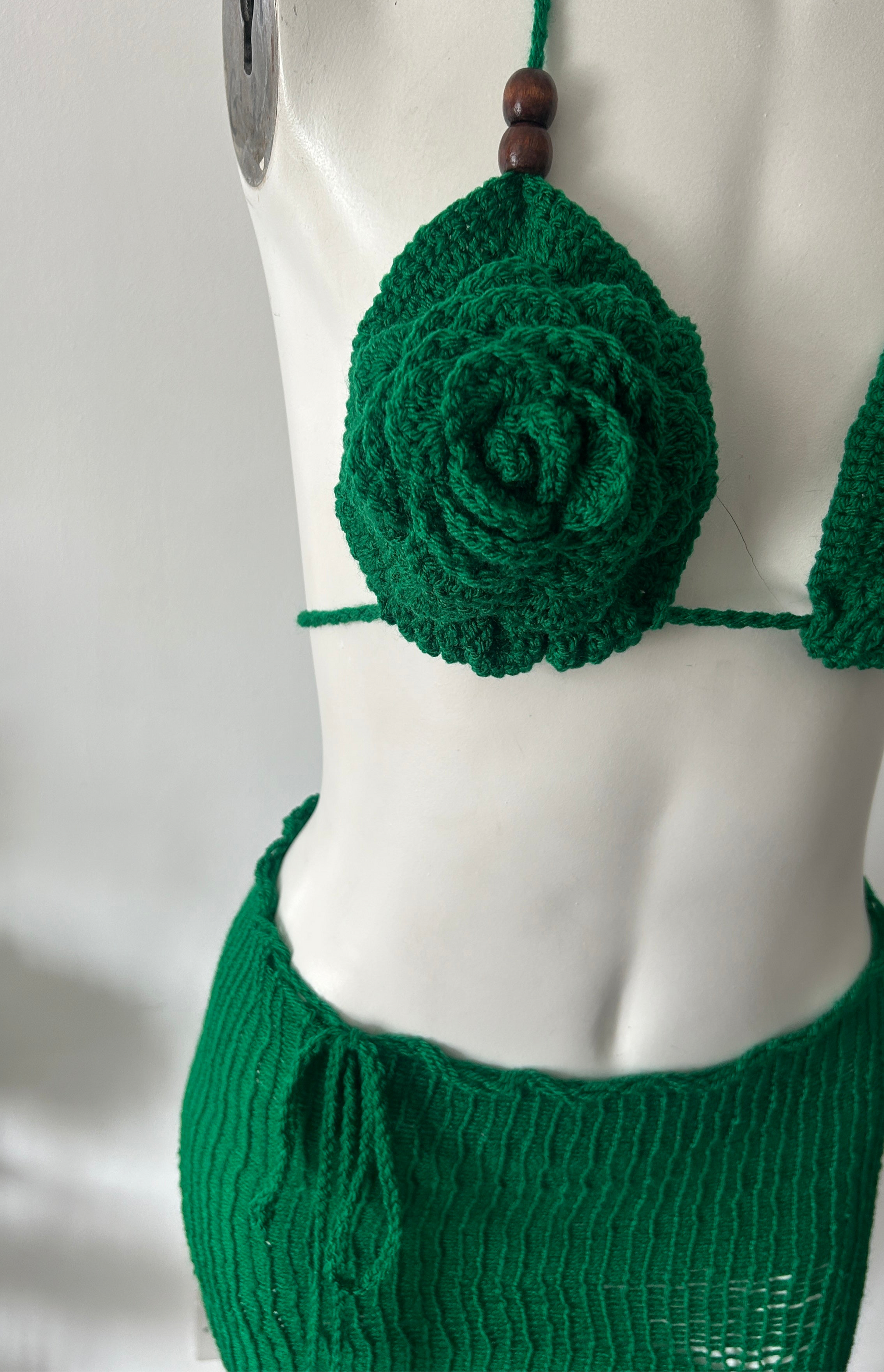 A Crochet two piece set. Made from breathable acrylic yarn. Backless flower top with neck and back ties. Together with a knitted tube skirt and ties.