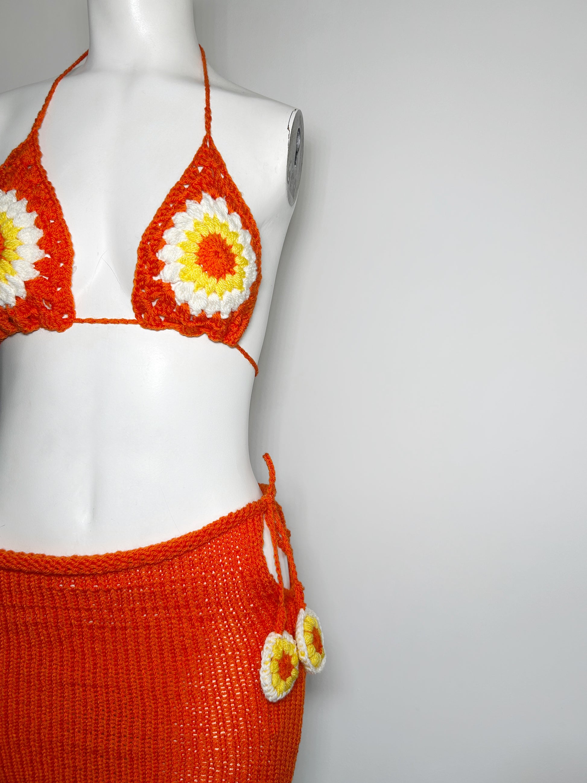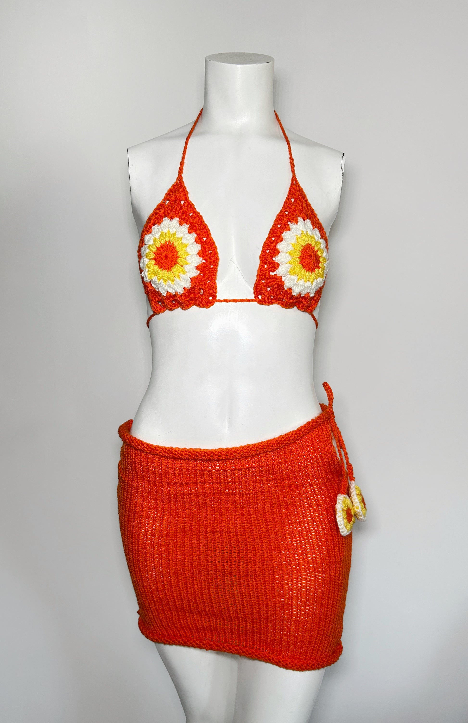 A Crochet two piece set. Made from breathable acrylic yarn. Backless with neck and back ties. Together with a knitted skirt with the one side option to tie giving versatility how you choose to wear it.